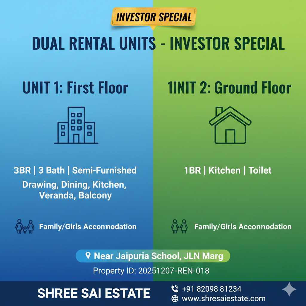 Residential Property Apartment / Flat for Sale in , JDA Approved First Floor: 3 Bedroom; Ground Floor: 1 Bedroom, Apartment / Flat in Near Jaipuria School, JLN Marg, Jaipur - Two separate units available